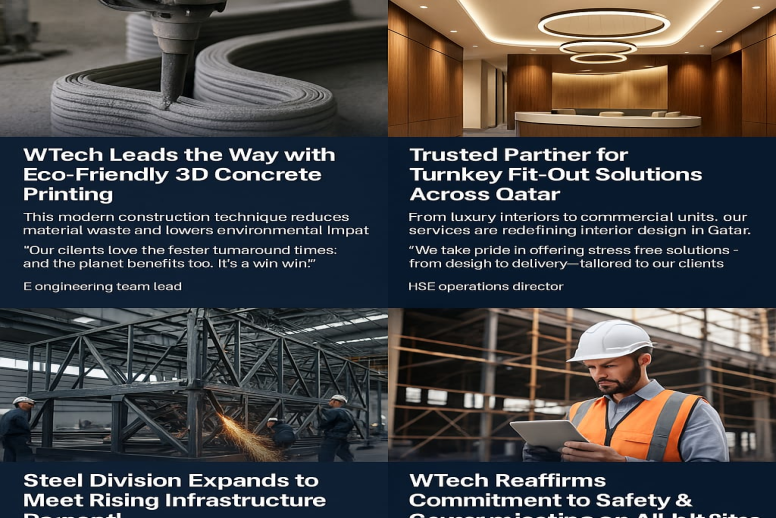WTech Construction is proud to announce the launch of a groundbreaking smart building project in the heart of Doha. This initiative blends cutting-edge technology with sustainable construction methods, marking a significant step toward the future of smart infrastructure in Qatar. Featuring advanced MEP systems, integrated IoT for energy efficiency, and 3D-printed components, the project exemplifies our commitment to innovation, safety, and eco-conscious development.
